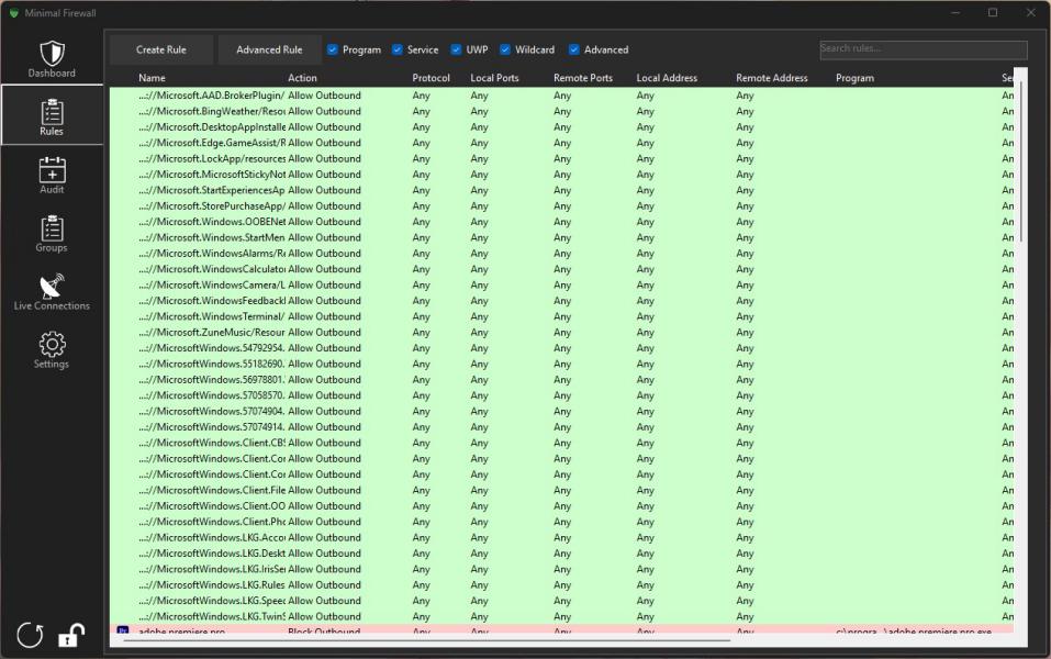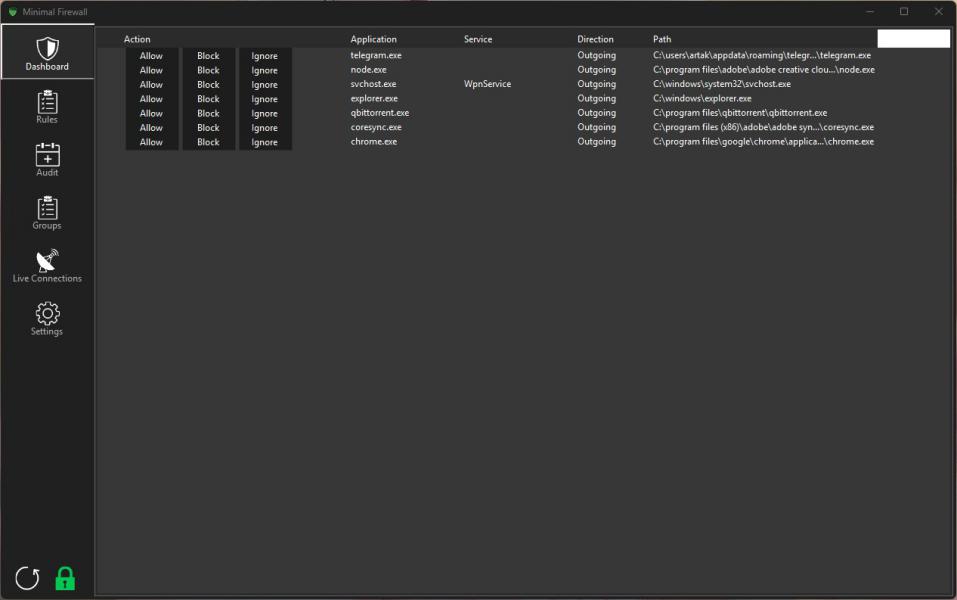Minimal Firewall — это лёгкий и удобный портативный инструмент, работающий поверх встроенного брандмауэра Windows и расширяющий его возможности. Он создан для того, чтобы пользователь мог полностью контролировать сетевую активность без вмешательства в ядро системы или отключения встроенных функций безопасности, сохраняя при этом стабильность Windows Defender. Благодаря своей архитектуре Minimal Firewall обеспечивает надёжный баланс между безопасностью и гибкостью, не допуская скрытых подключений или утечек данных.