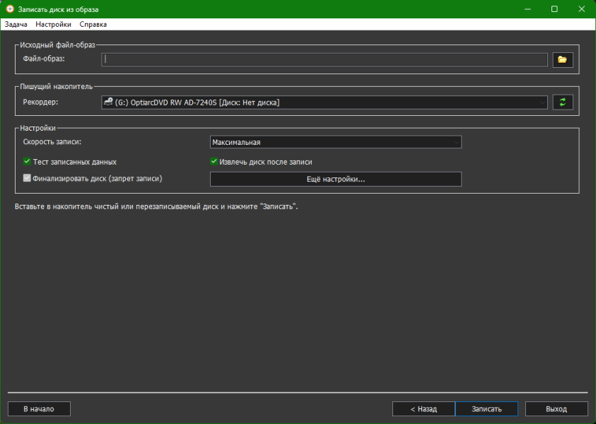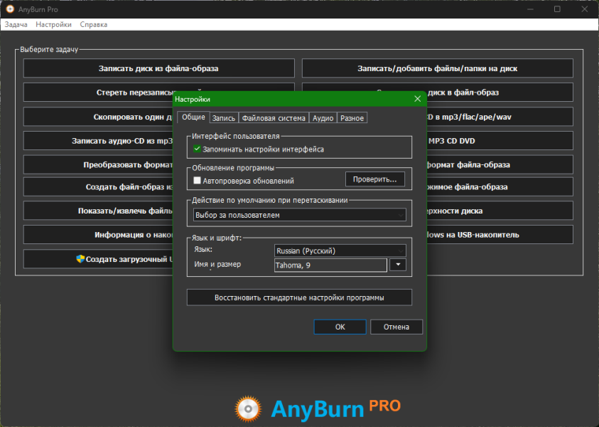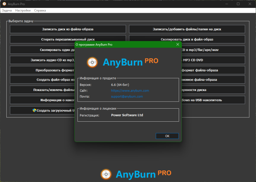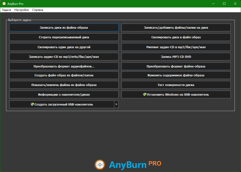 Any Burn — лёгкая, но функциональная бесплатная программа для работы с CD, DVD и Blu-ray дисками. Приложение отличается интуитивно понятным интерфейсом: все операции собраны в главном окне и удобно распределены по вкладкам. С помощью этой утилиты можно без труда записывать готовые ISO-образы, добавлять на диск файлы и папки, создавать Audio-CD из музыкальных композиций, стирать перезаписываемые носители, копировать или создавать образы дисков. Благодаря своей стабильности и минимальному размеру Any Burn может стать отличной заменой громоздким и платным решениям для работы с оптическими дисками.