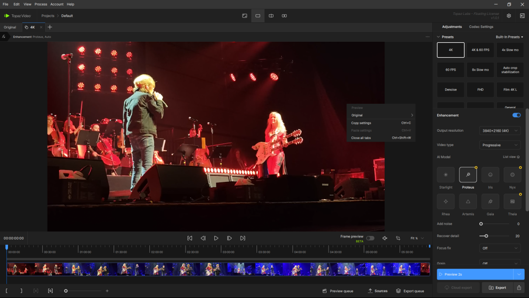 ● Новая ИИ-модель шумоподавления Nyx XL для всех платформ, обеспечивающая сохранение большего количества деталей, чем когда-либо прежде. ● Обновлённая модель Starlight Sharp на основе диффузии обеспечивает непревзойдённую чёткость видео и детализированное восстановление. Эта модель очень требовательна к ресурсам и доступна на Windows NVIDIA для локального или облачного рендеринга. ● Live Frame Preview — инструмент для мгновенной корректировки нескольких параметров модели, ускоряющий рабочий процесс. В настоящее время находится в бета-версии и несовместим с некоторыми моделями, включая Starlight. ● Новый общий пресет улучшения + настройка: один ползунок динамически регулирует несколько параметров модели, экономя время и упрощая обработку. ● Обновления правой панели: упрощённый доступ к пресетам, моделям и настройкам, обеспечивающий более быстрый и удобный рабочий процесс.