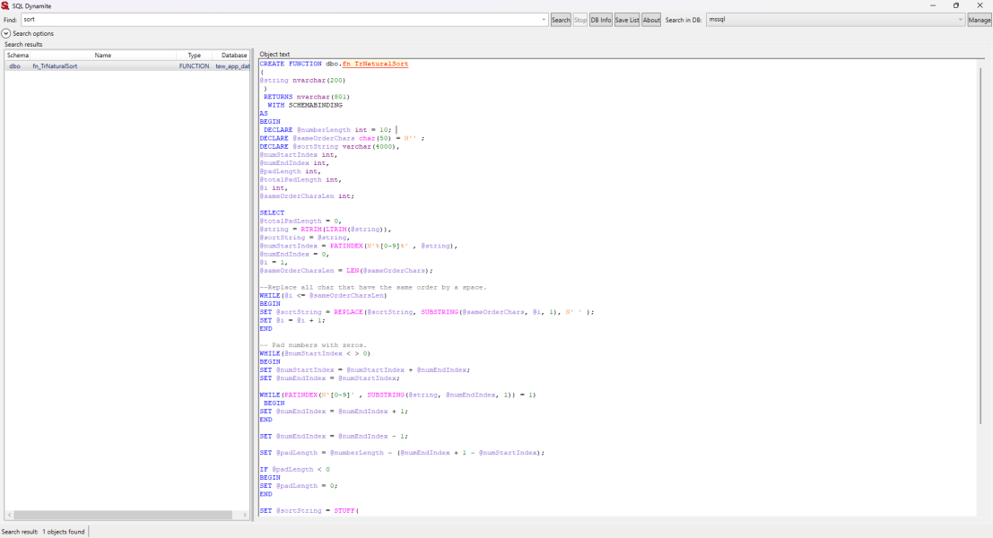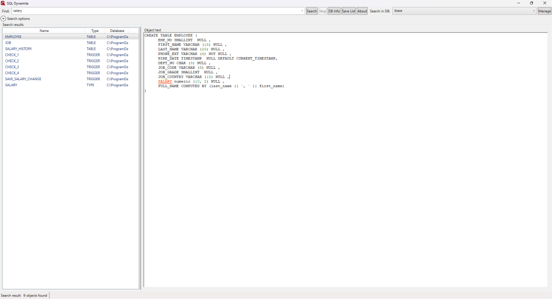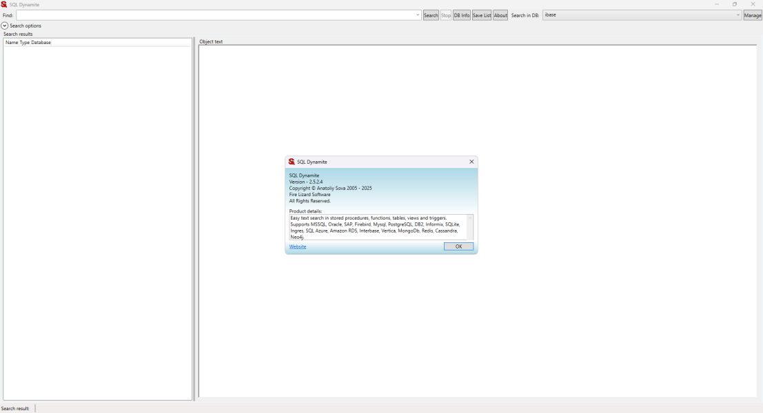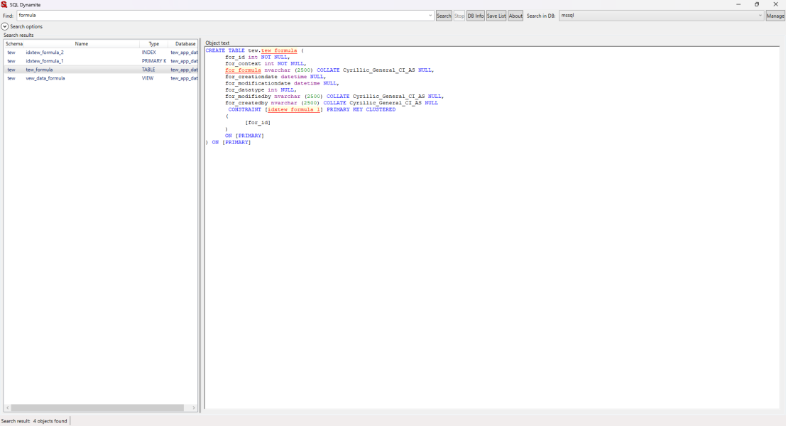 Программа для поиска по базам данных — это утилита, позволяющая исследовать объекты различных СУБД, включая пользовательские функции, хранимые процедуры, триггеры, представления, таблицы и индексы, внешние и первичные ключи, типы, синонимы и последовательности. С её помощью можно быстро находить нужный текст как в названиях объектов, так и внутри их содержимого. Поиск поддерживает работу с учётом регистра и без него, что делает инструмент гибким и удобным для администраторов и разработчиков баз данных.